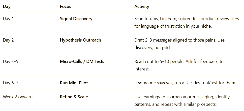 To help you see it in action, imagine this applied: You build a micro-pilot to reduce demo follow-up delay. You find two startups publicly complaining about lost deals. You message them: