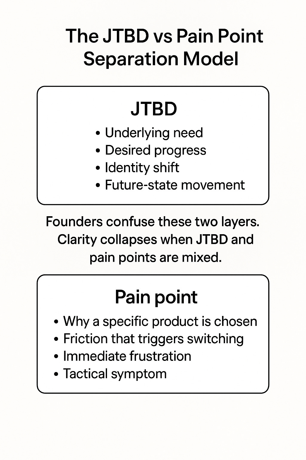 Most startups fail because they confuse pain points with the Job to be done or accomplished. Pain triggers choice. JTBD drives meaning, iden...
