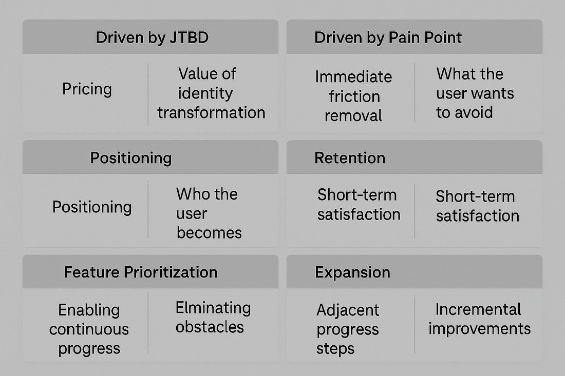 This is not self-help language. It is empirical psychology. Identity is the frame through which people interpret choices. A Job to be done or accomplished (JTBD) exists inside this identity narrative. It is the forward motion that carries someone from a current state to a desired future state. JTBD is not a task. It is a trajectory. Common identity JTBD patterns include: • chaotic to organized Pain points can exist at any part of this journey. They may influence timing, but they do not define the transformation. When founders design from pain points, they reduce the user to a set of irritations. When founders design from identity JTBD, they elevate the user to a person pursuing progress. This shift changes everything from product to brand to business model. Identity-driven JTBD explains why users stay with certain products even when cheaper or more convenient alternatives appear. Progress is sticky. Identity reinforcement is sticky. Pain relief is not. Functional needs are the base. Emotional needs elevate relevance. Identity needs drive long-term adoption. Pain Points Create Switching. JTBD Creates Markets.Pain points explain why someone might move from Tool A to Tool B. This distinction shapes entire markets. Uber did not succeed because taxis were painful. Many cities still have painful taxis, yet not all alternatives thrive. The pain point explains switching, but the JTBD explains demand. The JTBD for Uber was predictable, transparent, and controllable mobility. This JTBD enabled dynamic pricing, ETAs, marketplace ratings, and new forms of transportation. Spotify did not succeed because iTunes was frustrating. The JTBD was effortless discovery and emotional connection to music. Airbnb did not scale because hotels were generic. The JTBD was a desire to feel like a temporary local. Figma did not grow because Sketch was painful. The JTBD was a collaborative creation and shared visibility. Notion did not spread because Google Docs was insufficient. The JTBD was to design one’s own work environment, not just use a document. When founders confuse pain points and JTBD, they optimize for friction removal rather than progress creation. This limits product vision. It also creates weak business models because pain relief businesses are easy to copy and hard to differentiate. Why Founders Confuse JTBD and Pain PointsThree psychological dynamics cause this mix-up. Salience BiasPain is vivid. Identity is subtle. Founders fixate on what is loud, not what is important. Confirmation BiasFounders often anchor to the first problem they hear. Users articulate frustrations more easily than desires for progress. As Steve Jobs put it:
